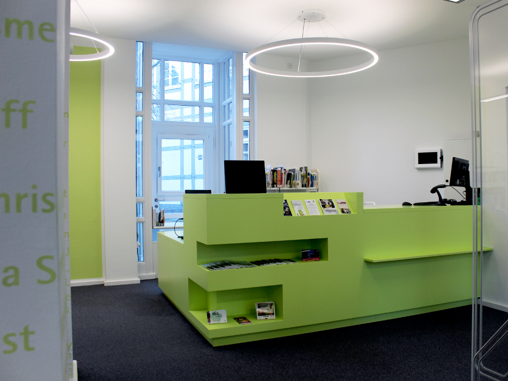 Der Eingang erhielt einen neuen Windfang aus zwei Automatik-Schiebetüren, zwischen denen die historische, hölzerne Außentür erhalten blieb. Dahinter gelangen die Besucher nun in einen zeitgemäßen Empfangsbereich mit funktionaler Möblierung.