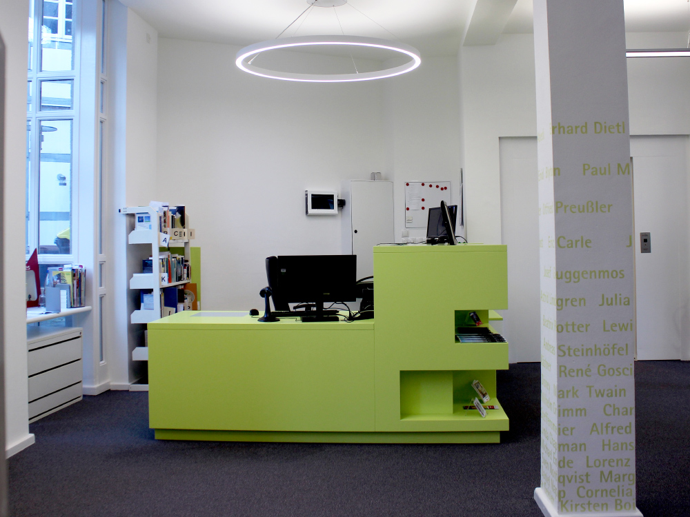 In allen Geschossen wurden Bodenkanäle für die Daten- und Elektroleitungen installiert, sodass störende Steckdosen und Datendosen an den Wänden entfallen konnten. Zudem wurden die Räume mit neuem Bodenbelag ausgestattet und malermäßig überarbeitet. Dabei wurde Wert auf große Farbflächen sowie ein dekoratives Leitsystem gelegt.