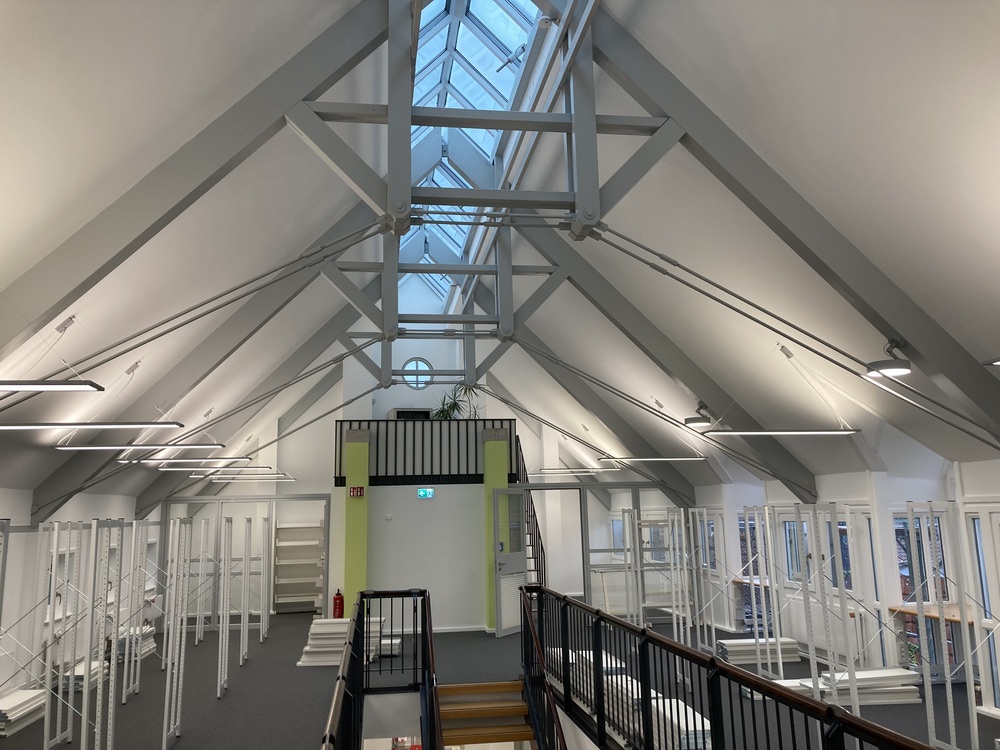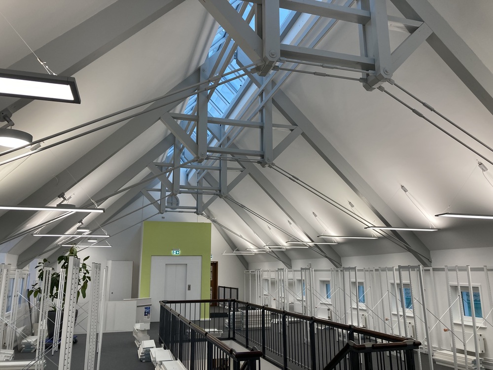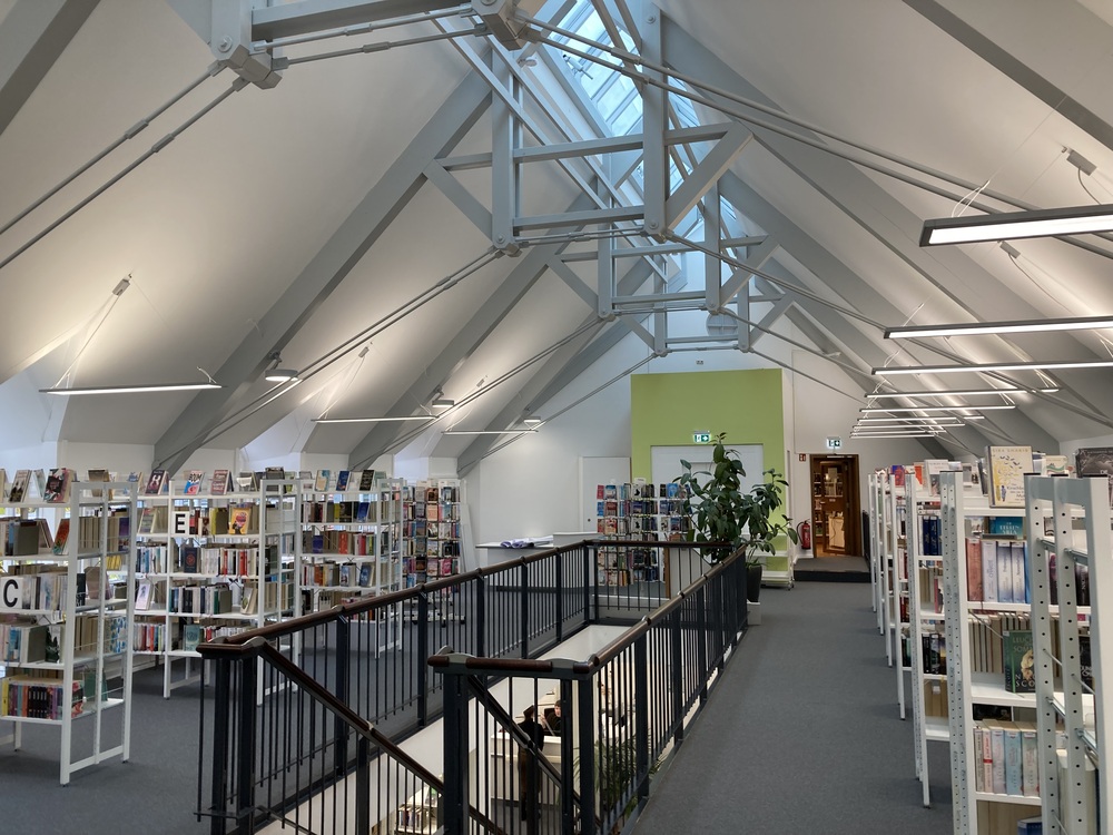 Das Beleuchtungskonzept bietet eine Grundbeleuchtung durch LED-Hängeleuchten sowie punktuelle Anbau-Downlights für die Lese- und Computerplätze. Die gesamte Netzwerktechnik wurde erneuert. Zudem wurde der Brandschutz auf den aktuellen Stand gebracht.