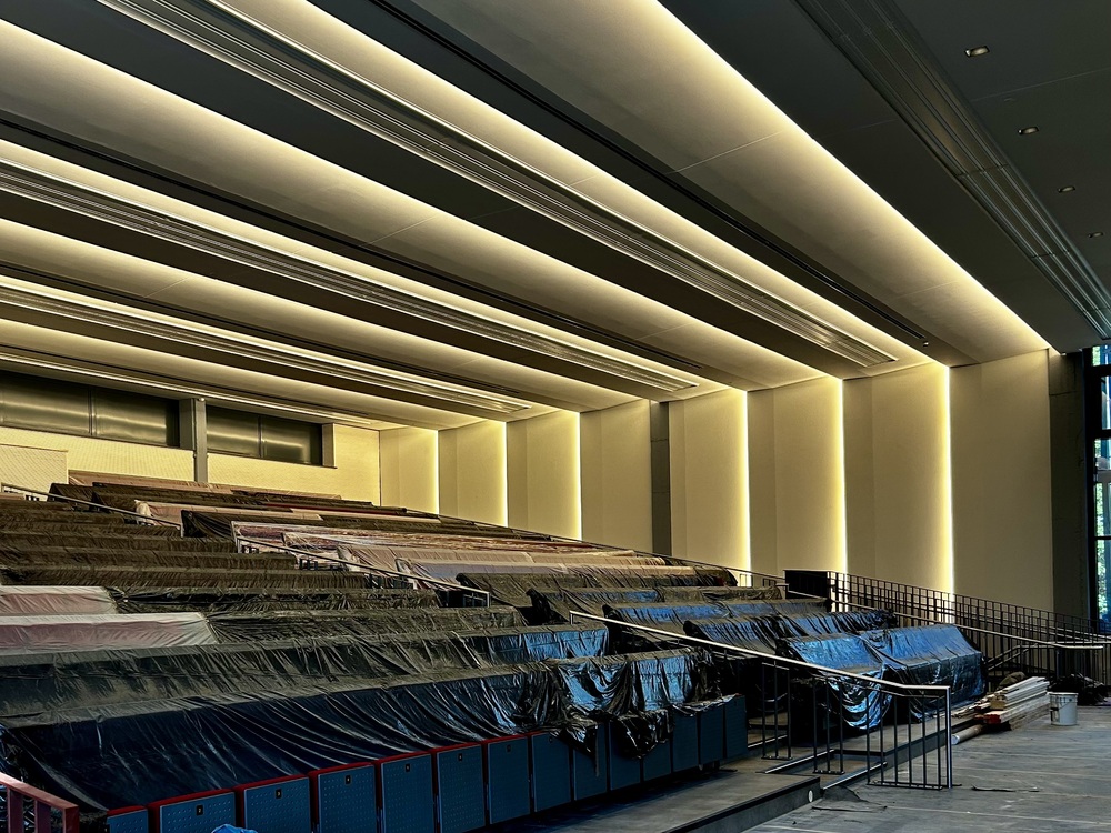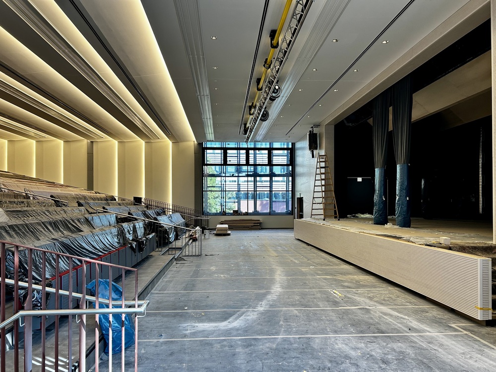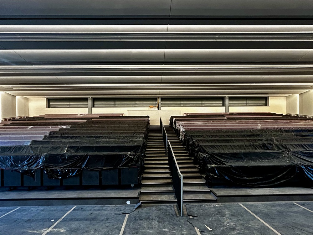 Es wird eine zeitgemäße Bühnentechnik installiert, die mit der Sprachalarmierungsanlage, Brandmeldeanlage sowie der Automatisierung der Beleuchtung des Gebäudes gekoppelt ist.