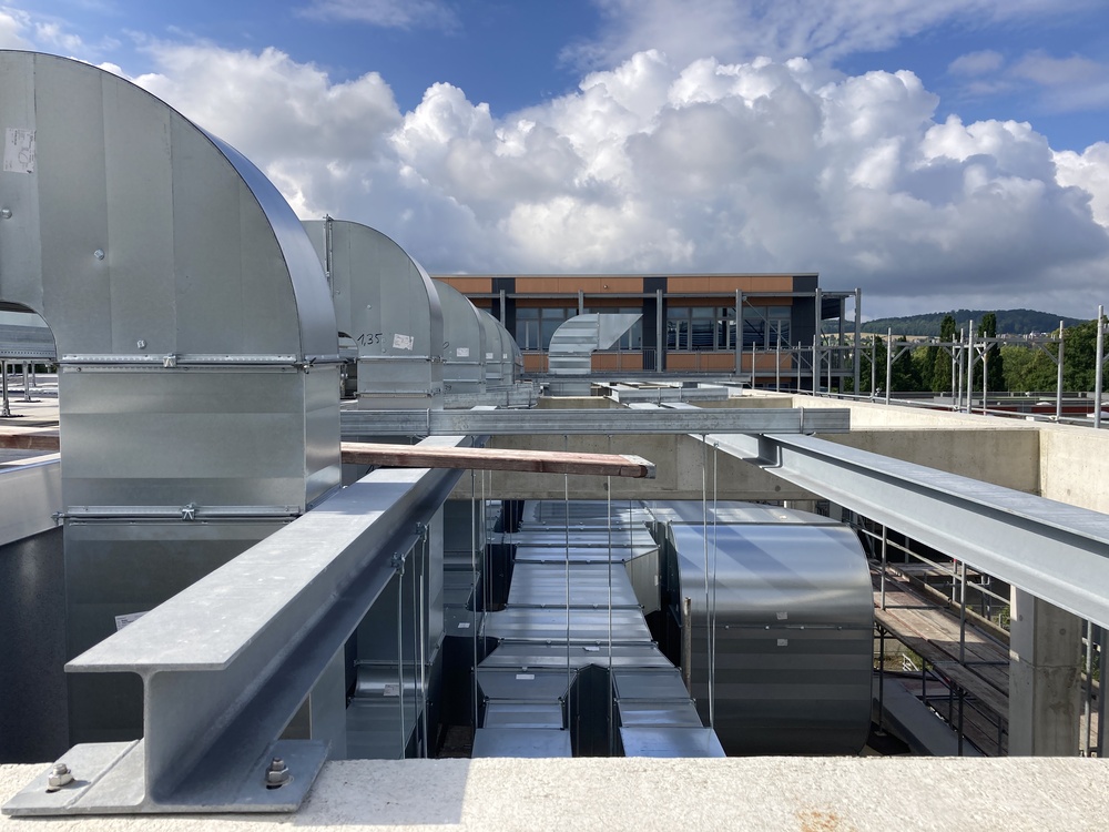 Zur Belüftung des Zuschauerraums wird eine Zu- und Abluftanlage mit Wärmerückgewinnung, Heizregister und Kühlregister sowie ein Kaltwassersatz auf dem Dach des Anbaus angeordnet. Die Zuluft wird auf Raumtemperatur vorkonditioniert. Im Winter erfolgt die Ausregelung über die Deckenstrahlplatten der Heizung. Eine weitere Lüftungsanlage wird in der bestehenden Technikzentrale angeordnet. Sie belüftet mit vergleichbarer Technik das Foyer. Die Sanitärräume und Umkleiden erhalten jeweils ein separates Zentralgerät zur Be- und Entlüftung mit Wärmerückgewinnung.