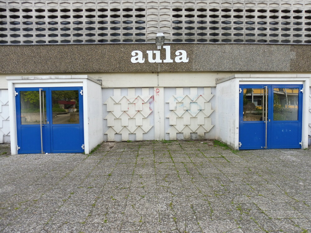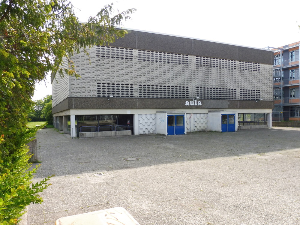 Gegenstand der Bauaufgabe ist die Aula der Schule, ein freistehender massiver Baukörper aus den 1970er Jahren. Im Erdgeschoss befinden sich das Foyer und die Umkleideräume, der Bühnen- und Zuschauerraum liegt im 1.OG.