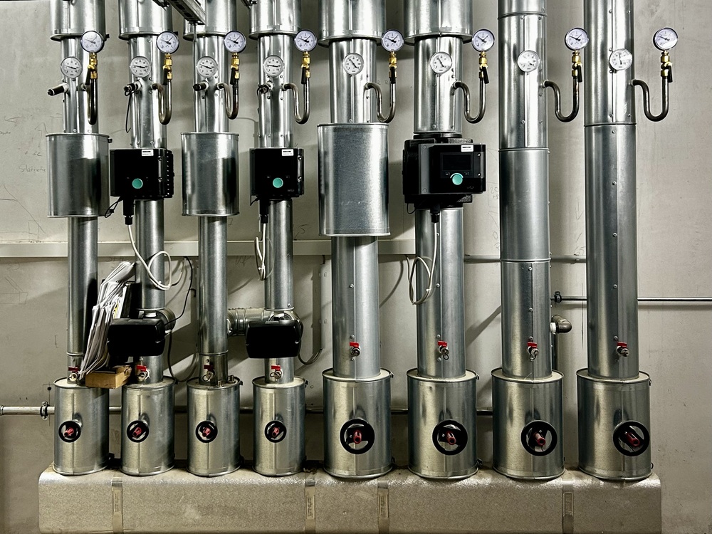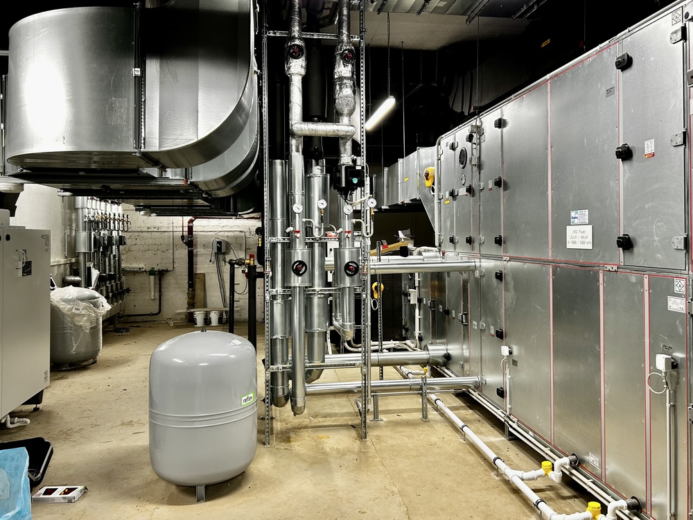 Die Wärmeverteilnetze sowie Trinkwasser- und Abwasserleitungen werden neu aufgebaut und mit neuen Raumheizflächen und Sanitärobjekten versehen. Die bestehende Fernwärmeübergabestation wird beibehalten.