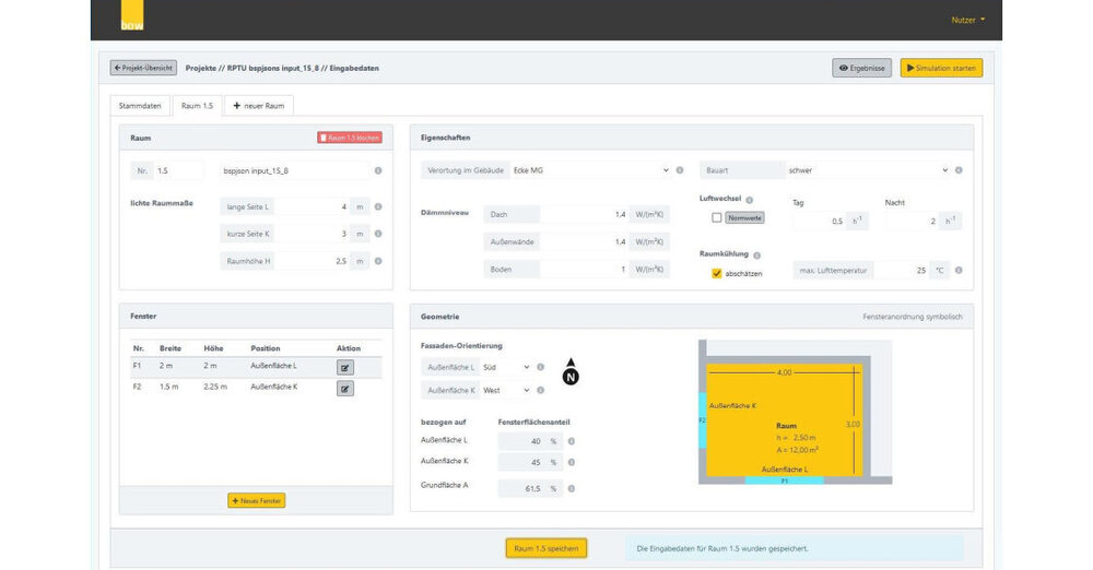 Die Software-Oberfläche zeichnet sich aus durch eine intuitive Bedienbarkeit, die schnelle Erfassung des Gebäudestandorts und der Gebäudedaten, die Abbildung normativer oder frei gewählter Randbedingungen, die Auswahl zu verwendender Testreferenzjahre, die automatisierte Übernahme der zum Gebäude-Standort gehörigen Klimadatensätze, die Ausgabe der operativen Temperatur, der Raumluft-Temperatur und des Kühlenergiebedarfs, die Ausgabe der Überschreitungsdauern im Vergleich mit normativen Vorgaben.
