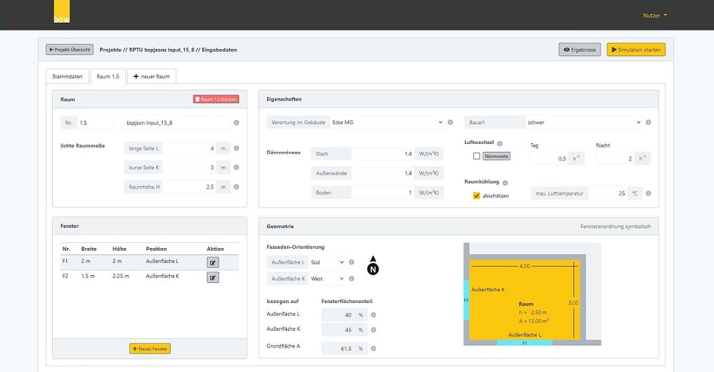 Die Software-Oberfläche zeichnet sich aus durch eine intuitive Bedienbarkeit, die schnelle Erfassung der Gebäude- und Raumdaten, die Abbildung normativer oder frei gewählter Randbedingungen sowie die automatisierte Übernahme der zum Gebäude-Standort gehörigen Klimadatensätze und die Auswahl zu verwendender Testreferenzjahre. Als Ergebnisse werden die operative Temperatur, die Raumluft-Temperatur und der Kühlenergiebedarf im Jahresverlauf graphisch angezeigt, sowie Übertemperaturgradstunden und Überschreitungsdauern bestimmt für einen Abgleich mit normativen Vorgaben.