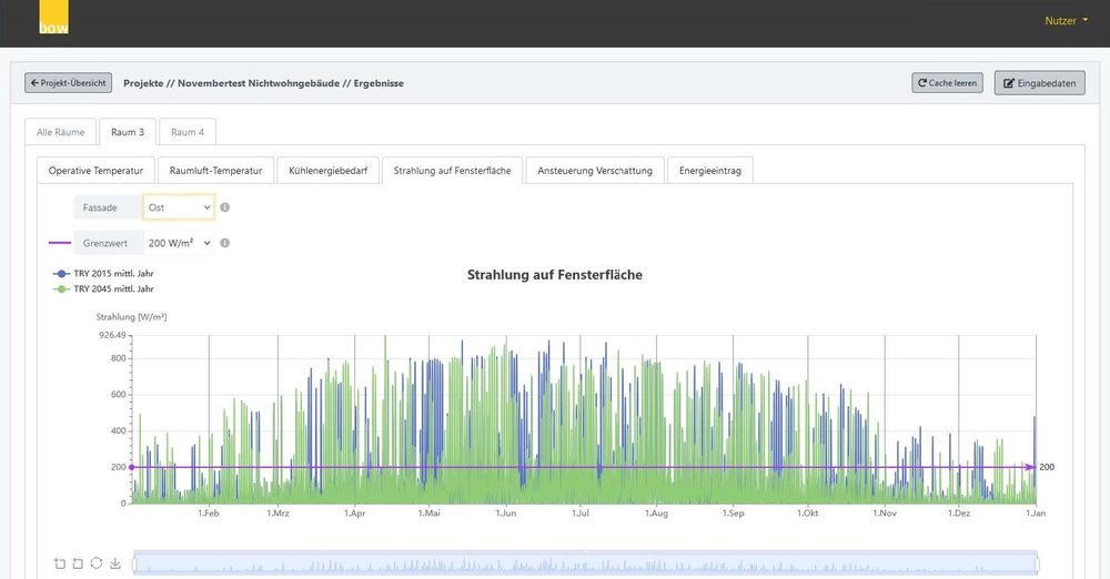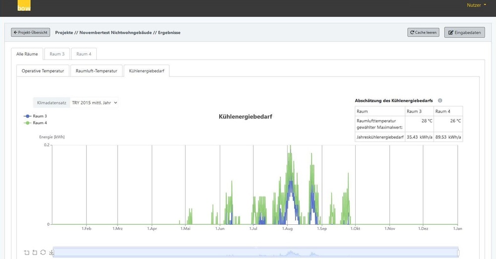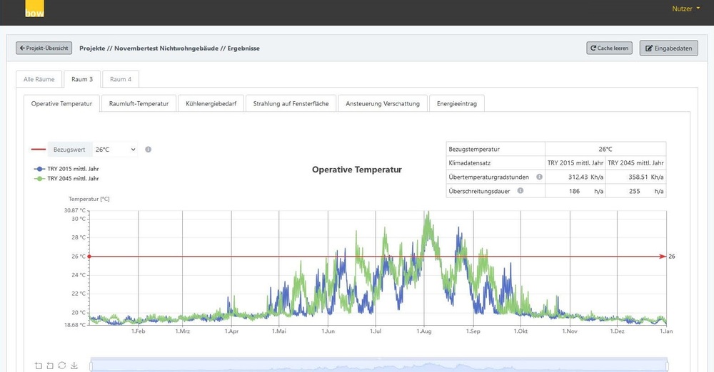 Neben den erwarteten Raumtemperaturen ermittelt die Software die nötige mechanische Kühlleistung, um eine frei gewählte Grenz-Raumtemperatur einzuhalten. Damit können für Konstellationen, bei denen diese Grenztemperatur heute ohne mechanische Kühlung eingehalten wird, künftig nötige Kühlmaßnahmen infolge des fortschreitenden Klimawandels prognostiziert werden.